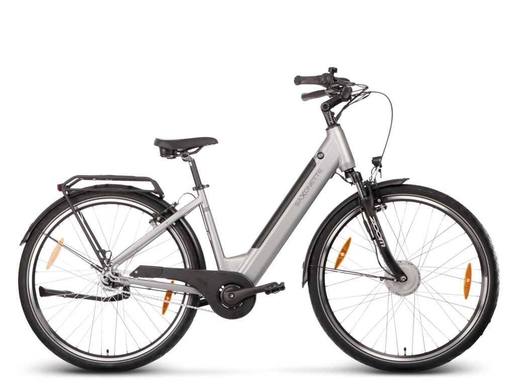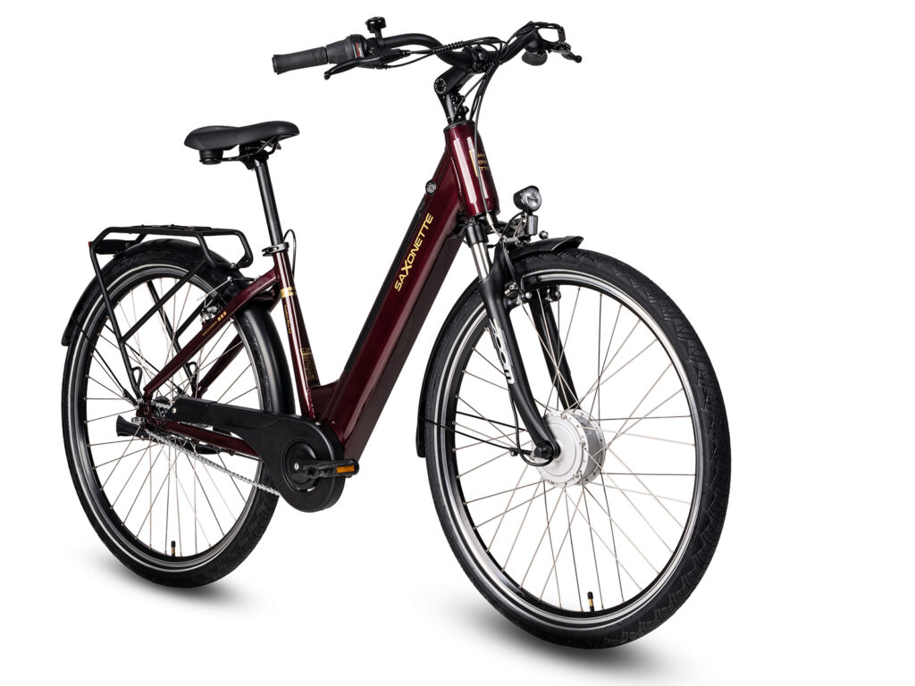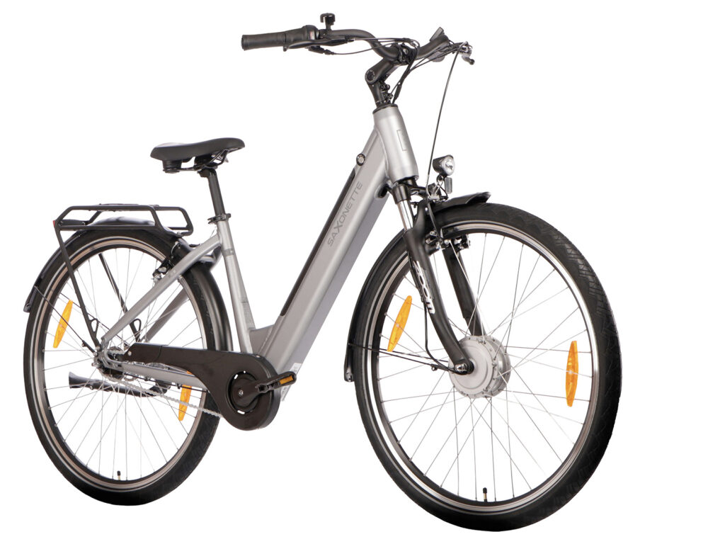 Het lage instapframe met een zadelbuislengte van 45 cm is afgewerkt met een elegante glanslak in zilverkleur, cremewit of bordeauxrood. Dat deze e-bike in Duitsland is ontwikkeld merk je aan de gebruikte onderdelen, zoals de robuuste verende voorvork, maar vooral aan het feit dat de fiets is voorzien van zowel V-brakes als een terugtraprem. Zekerheid voor alles, zoals ook blijkt uit de goede verlichting.